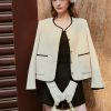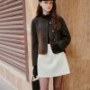 Áo khoác da dáng ngắn, phom croptop suông vừa, giúp tổng thể trông gọn gàng và cân đối.